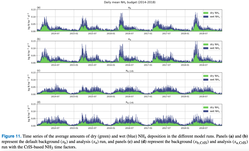 De CrIS-satelliet aan boord van de Suomi NPP biedt sinds 2012 dagelijkse wereldwijde ammoniakmetingen met een resolutie van ongeveer 14 km (het is inmiddels mogelijk om met een hogere resolutie te meten, zie ook dit artikel over Caeli). Dit maakt het mogelijk om regionale patronen van ammoniakemissie en -depositie in detail te bestuderen. Het paper van Van der Graaf et al. (2022) laat zien hoe deze satellietwaarnemingen gebruikt kunnen worden om modelberekeningen te verbeteren door middel van data-assimilatie.