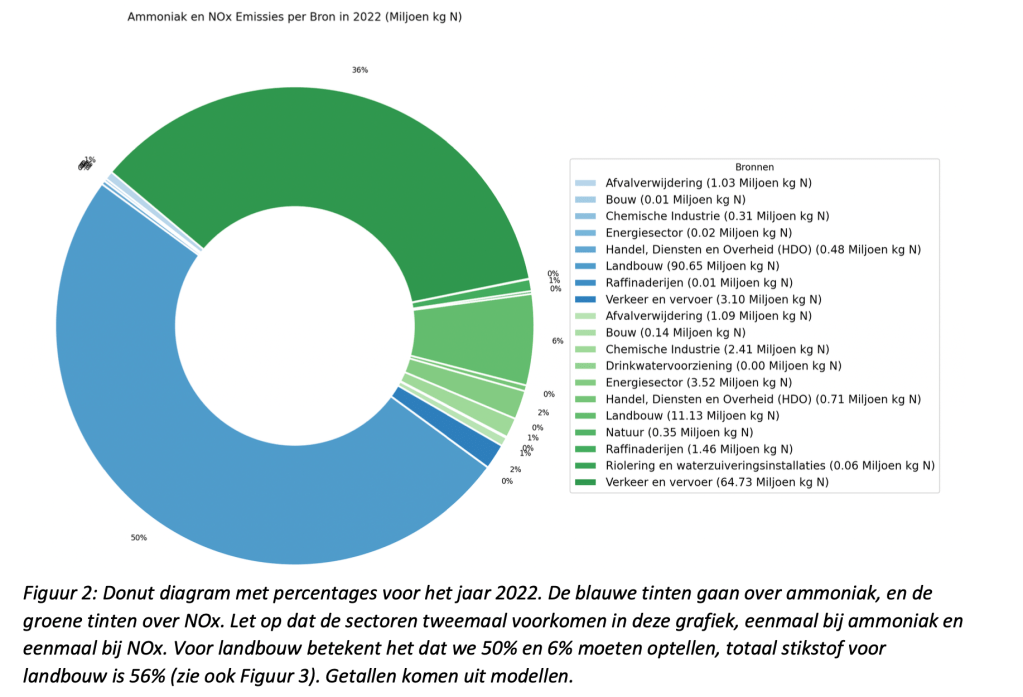 In 2022 bedroeg de uitstoot van ammoniak (NH₃) volgens de emissieregistratie 95,6 miljoen kilogram stikstof (N). Daarvan kwam 90,65 miljoen kilogram uit de landbouw – dus zo’n 95 procent van het totaal. De cijfers van WUR via het NEMA-model wijken iets af: voor 2021 rekenden zij met 111 miljoen kilogram NH₃, oftewel ongeveer 91 miljoen kilogram N. Voor 2022 zijn hun NEMA-schattingen nog niet beschikbaar.