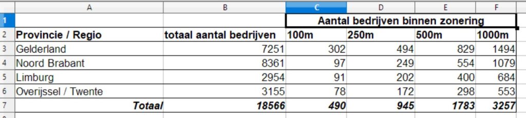 Een analyse van GIS-data in drie provincies (Limburg, Brabant en Gelderland) komt uit op 945 agrarische bedrijven binnen 250 meter van een Natura2000-gebied. Het gaat daarbij specifiek om veehouderijen: pluimvee, varkenshouderijen en melkvee. Data uit andere provincies is helaas niet openbaar beschikbaar, wat het lastig maakt om een exact landelijk beeld te schetsen. Maar extrapolatie op basis van deze drie provincies wijst eerder op een totaal aantal van ongeveer duizend bedrijven, niet 1800.
