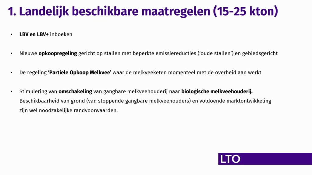 Of hun lijn politiek voldoende draagvlak vindt, zal onder meer blijken in het kamerdebat op 22 mei. LTO heeft aangekondigd haar ledenvoorstellen mee te nemen naar Den Haag, met als doel een spoedige en houdbare oplossing voor het vastgelopen stikstofbeleid.