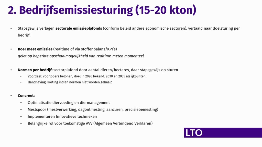 Bij bedrijfsemissiesturing wil LTO ondernemers “aan het stuur” laten zitten met langjarige gemiddelde reducties, gemeten via real-time systemen, KPI’s of stoffenbalansen. Beloning voor voorlopers en normering op bedrijfsniveau zijn onderdeel van dit voorstel.