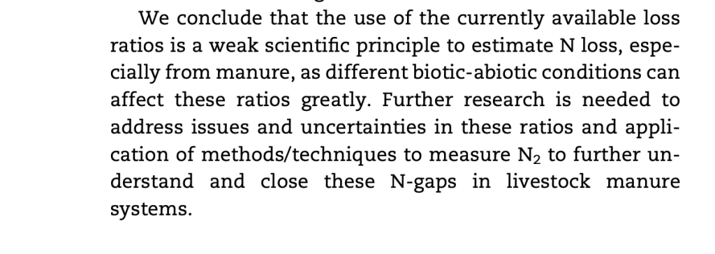 Daarbij moet worden onderkend dat ook de huidige officiële ramingen zeer grote onzekerheden kennen. Emissiefactoren voor N₂ en N₂O zijn grotendeels gebaseerd op literatuurwaarden en ratios uit oudere bodemstudies (Oenema et al., 2000), en niet specifiek gevalideerd voor mest. De variatie in meetresultaten is groot: afhankelijk van methode, mesttype, temperatuur, zuurstofgehalte en opslagomstandigheden kan de foutmarge oplopen tot 50–100%. Studies zoals die van Neysari et al. (2023) laten zien dat de standaarddeviatie in N₂/N₂O-verhoudingen meer dan 100% kan bedragen.