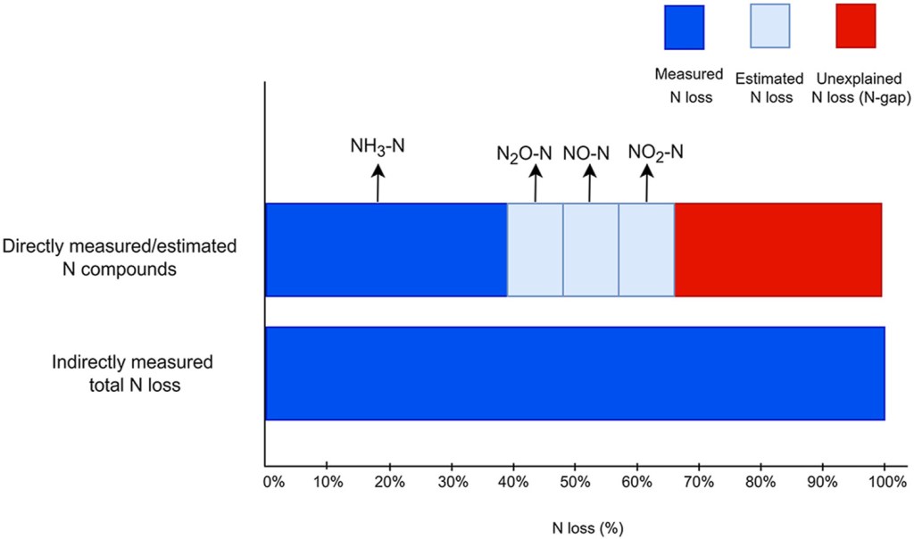 Een belangrijk concept in dit verband is de N-gap: het verschil tussen de stikstofverliezen die op basis van directe metingen (NH₃, N₂O, NO) worden geregistreerd en de verliezen die volgen uit stikstofbalansen. Deze gap wordt grotendeels toegeschreven aan N₂-emissies, die moeilijk direct meetbaar zijn door de hoge achtergrondconcentratie in de atmosfeer. Officiële schattingen uit het NEMA-model plaatsen de overige gasvormige verliezen (exclusief NH₃) op circa 2–2,5% van de totale N-excretie. Recente metingen, zoals die van De Boer (2023) in melkveestallen, suggereren echter dat het werkelijke aandeel veel hoger kan liggen, tot wel 9–10% N₂, waarmee de totale gasvormige verliezen in stallen ruim zouden verdrievoudigen.