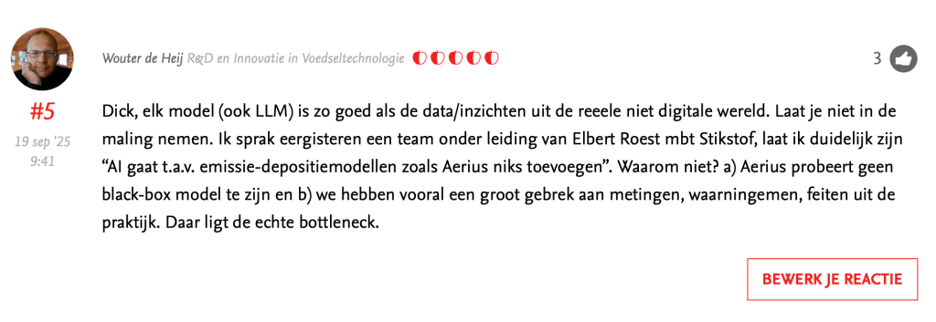 Zelfs Jan Willem Erisman erkent inmiddels dat Aerius “niet geschikt is voor vergunningverlening”. Toch wordt het systeem nog altijd als fundament onder beleid en rechtspraak gelegd. Het bestuur is lamgeslagen, omdat het te lang vertrouwde op het idee dat “de wetenschap het wel zou weten”. Daarmee verdwijnt visieontwikkeling, belangenafweging en het maken van keuzes uit beeld. Het wetenschappelijke debat zelf is verengd en gesloten geraakt, terwijl juist diversiteit en tegenspraak de motor zijn van kennisontwikkeling.