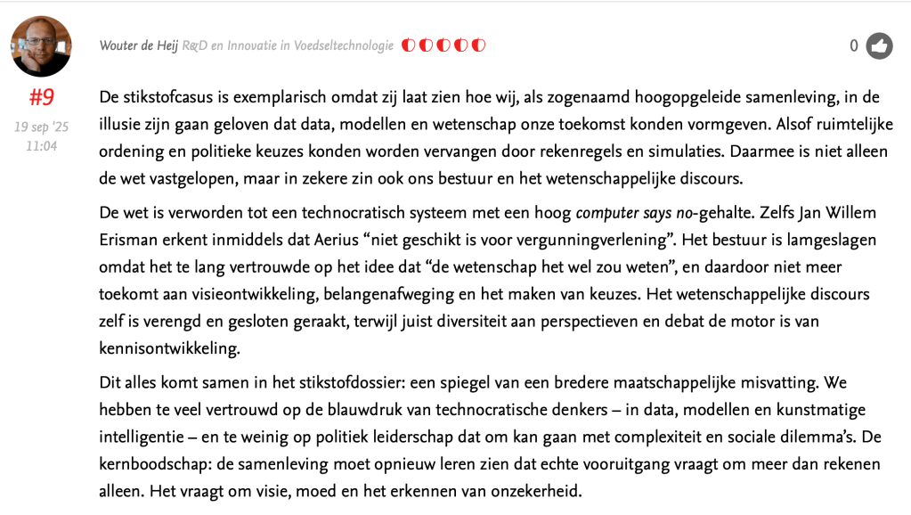De stikstofcasus is exemplarisch voor een bredere maatschappelijke misvatting. Zij laat zien hoe wij, als zogenaamd hoogopgeleide samenleving, zijn gaan geloven in de illusie dat data, modellen en wetenschap onze toekomst konden vormgeven. Alsof ruimtelijke ordening en politieke keuzes konden worden vervangen door rekenregels en simulaties. Daarmee is niet alleen de wet vastgelopen, maar in zekere zin ook ons bestuur en het wetenschappelijke discours.