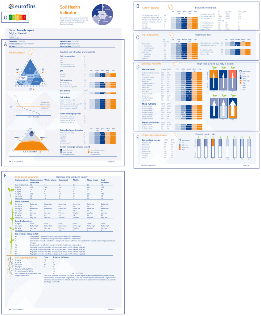 De derde stap is het samenstellen van een uitgebreid bodemgezondheidsrapport. Dit rapport legt verbanden tussen alle gemeten parameters en plaatst ze in zeven grote thema’s: fysica, biologie, koolstof, nutriënten, zware metalen, beheeradvies en een samenvattende ABCDE-score. Die score is gebaseerd op een voorstel van de Europese Commissie en maakt het mogelijk om bodems te classificeren van “A: zeer gezond” tot “E: zwaar gedegradeerd”.