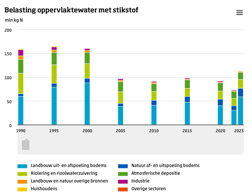 Los van de bron-toerekening is het relevant om het totale plaatje te blijven zien. CBS beschrijft dat de totale belasting van het oppervlaktewater met stikstofverbindingen in de periode 1990–2023 is gedaald (van circa 160 naar 114 miljoen kg N), maar dat 2023 een uitschieter was door uitzonderlijk veel neerslag, met meer uit- en afspoeling. (Centraal Bureau voor de Statistiek) Dat soort jaren laat precies zien waarom “landbouw” als categorie zo gevoelig is: veel routes lopen via land (landbouw én natuur), maar worden sterk gestuurd door weer, hydrologie en bodems.