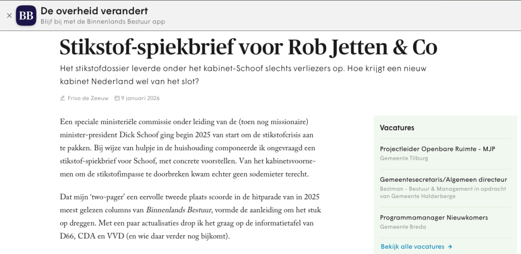 Friso de Zeeuw schreef in Binnenlands Bestuur een “stikstof-spiekbrief voor Rob Jetten & Co”. In de kern roept hij op tot een offensief rond kwetsbare natuur, een langetermijn-gebiedsaanpak, het opruimen van “microdeposities” die projecten blokkeren, en het repareren van “gemankeerde” onderdelen van het beleid (KDW/AERIUS, wetgeving, doelen).