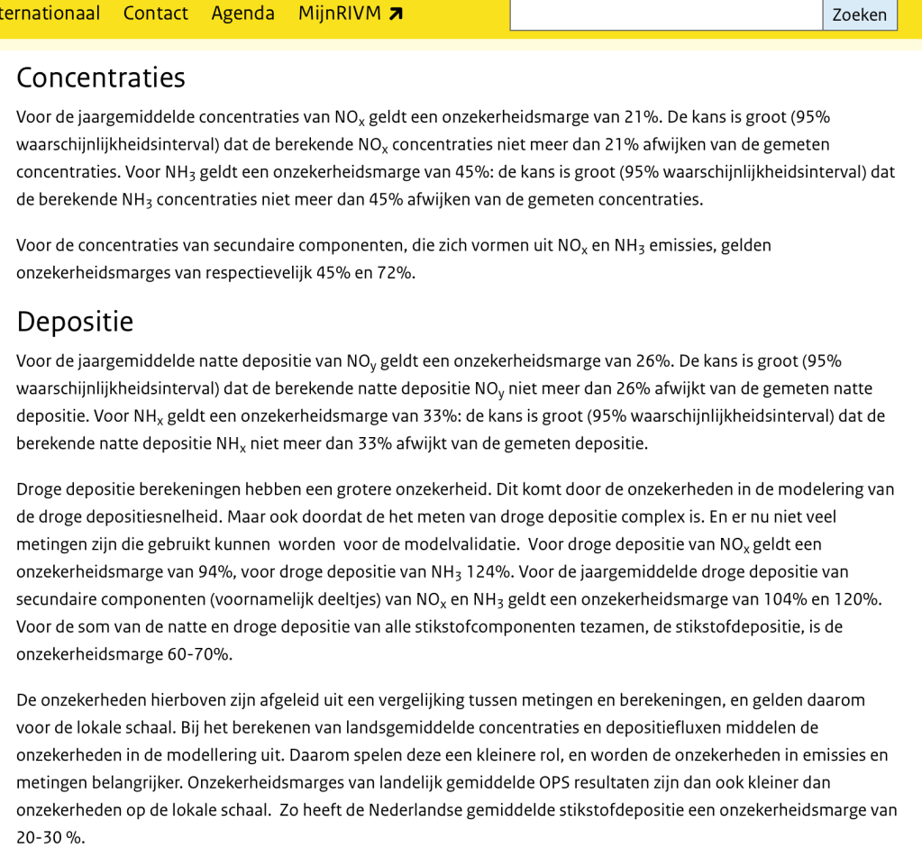 Het probleem zit niet alleen in emissies, maar juist in wat daarna gebeurt: verspreiding, omzetting, natte en droge depositie. RIVM zelf rapporteert onzekerheden van circa 124% voor droge depositie en rond 70% voor totale depositie. Dat zijn geen marges die zich verdragen met het huidige juridische gebruik van AERIUS. Het COTAG-rapport bevestigt dit beeld en wijst expliciet op structurele beperkingen in model-validatie.