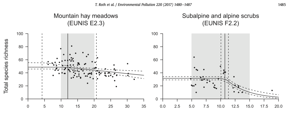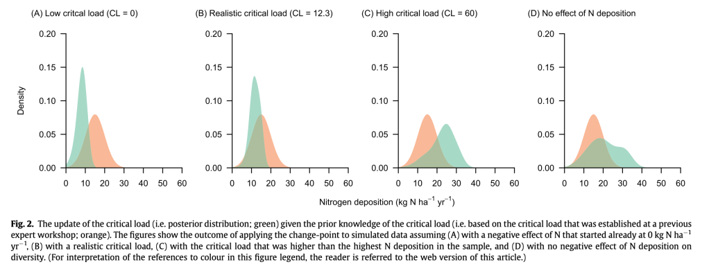 Zelfs met meer data en betere modellen zal de onzekerheid nooit nul worden. De studie van Roth et al. (2017) laat dit goed zien. Voor ‘(sub)alpine scrubs’, een habitattype waarvoor zij over een robuuste dataset beschikten, wisten zij de onzekerheid aanzienlijk te verkleinen. De aanvankelijke (prior) SD was ±5 kg, maar na analyse van de data werd de uiteindelijke (posterior) 95% betrouwbaarheidsinterval slechts 1,2 kg breed. Dit komt neer op een resterende standaarddeviatie van circa ±0,6 kg N/ha/j. Dit kan worden gezien als een ‘best-case’ scenario: onder ideale omstandigheden, met veel data en een duidelijk signaal, blijft er een fundamentele onzekerheid van minimaal ±1 kg over.