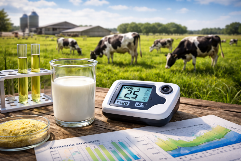 - Rantsoenafhankelijkheid: Een Vlaamse studie toont aan dat dezelfde melkureum-waarden (bijv. 18 vs 25 mg/dl) op verschillende ruwvoertypen (gras- vs maiskuil) tot dezelfde urine- en mest-N-excretie kunnen leiden. Interpretatie is dus sterk ruwvoertype-afhankelijk.